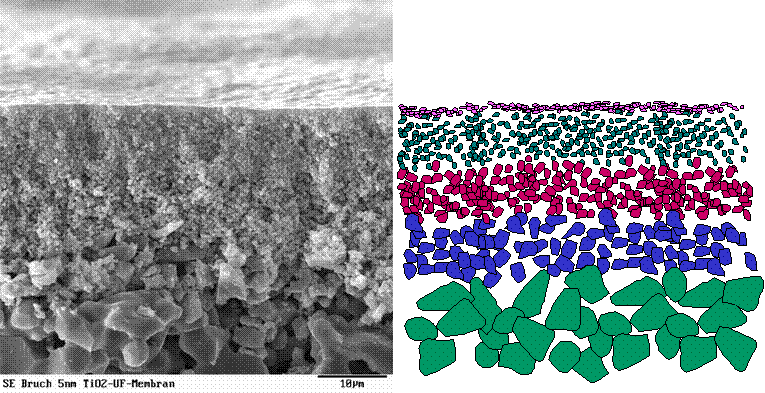 Our interest is to employ a membrane catalyst for this purpose. The concept is based on TCM (tubular catalytic membrane). These assymetric membranes are generally used for separation processes such as filtration. The membranes are composed of several layers having different pore sizes ranging from 3µm to 5 nm. The top membrane layer may be either Al2O3, ZrO2, TiO2 etc. In our case the membrane may be from either modified -alumina or carbon. Typical membrane is depicted below (permission of H.I.T.K.- Hermsdorf)